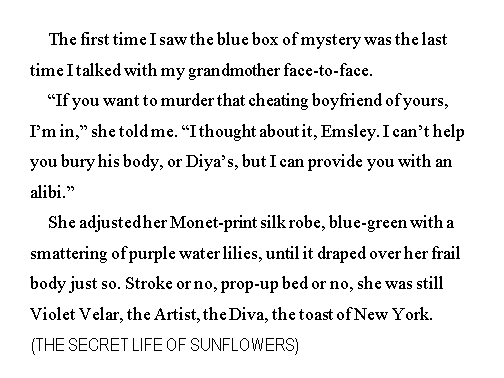 Special Giveaway: Marta is giving away an ebook copy of THE SECRET LIFE OF SUNFLOWERS to one lucky reader who comments on her Karen’s Killer Book Bench blog.